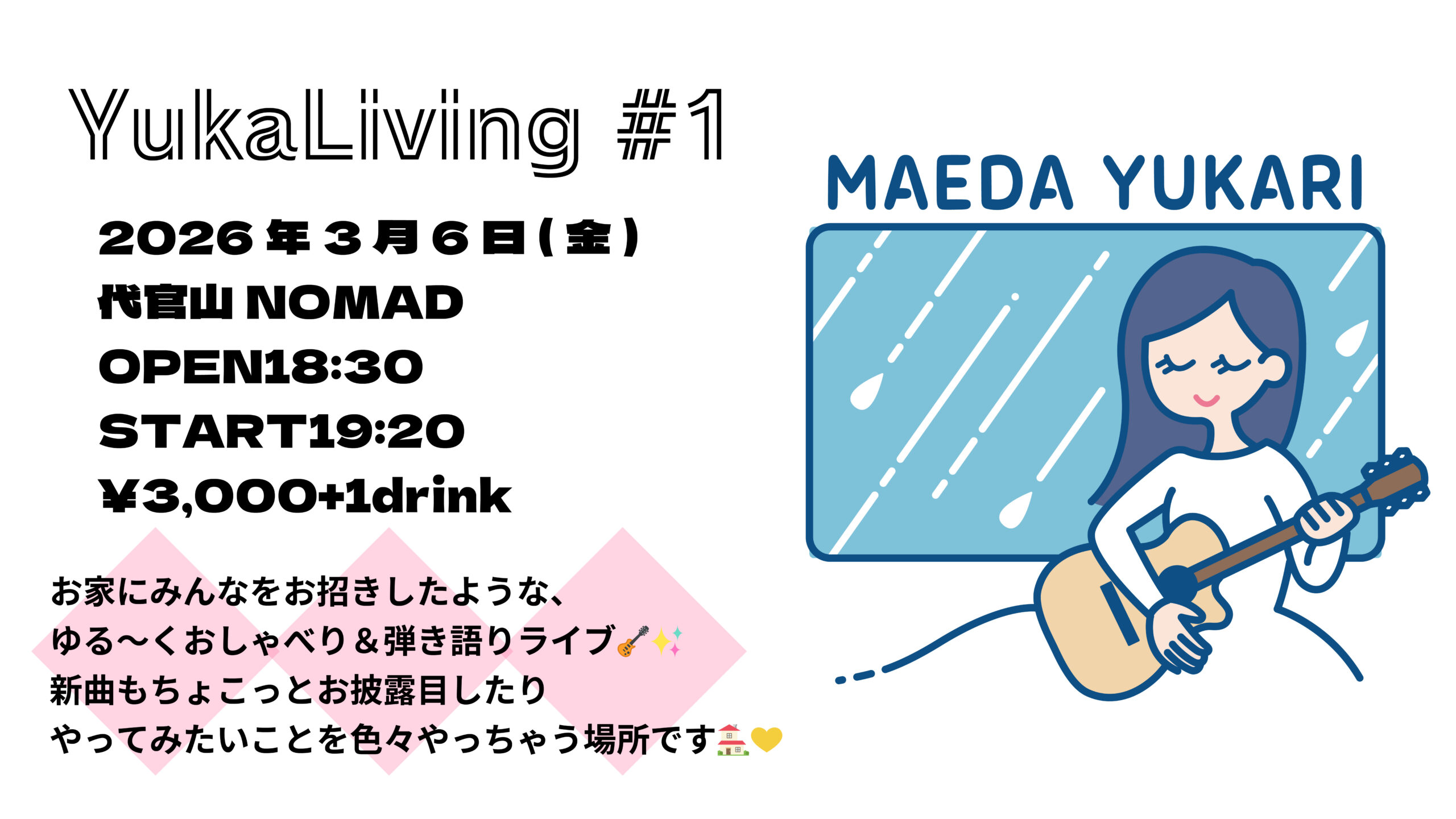 新企画 ◤YukaLiving◢ お家にみんなをお招きしたような、 ゆる〜くおしゃべり&弾き語りライブ🎸✨ 新曲もちょこっとお披露目したり、 やってみたいこと色々やっちゃう場所です☺️💛 第1回目は 3/6(金) に開催決定📣 探り探りですが、ホッとできるイベントにしていけたらいいな🤭